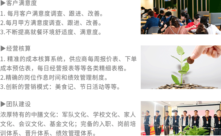 为客户提供专业、一站式团餐运营团队,为大众提供健康、安全、新鲜的美味佳肴