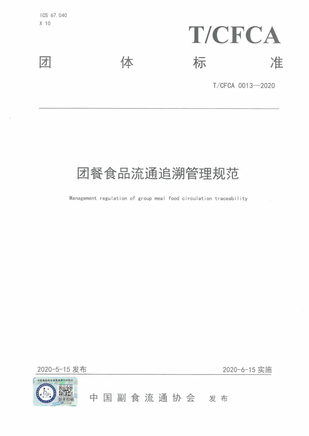 《团餐食品流通追溯管理规范》是根据《中华人民共和国标准化法》、《关于深化标准化工作改革方案》(国发〔2015〕13号)、《团体标准管理规定(试行)》(国质检标联〔2017〕536号)的相关要求,依照《中国副食流通协会团体标准管理办法》参与制定的团体标准,拟于6月15日正式实施。