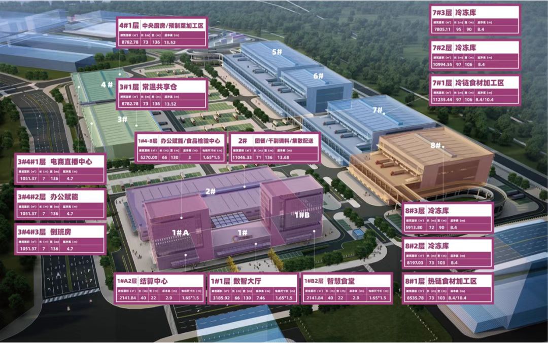 园区建筑面积超过18.3万平米,具备完善的食材供应链体系,拥有20万吨现代化高标准多温层仓储、中央厨房、预制菜、包装食品、肉类水产、进口生鲜产品生产加工中心,300余辆专用菜篮子运输车运力,覆盖重庆主城区及38个区县。