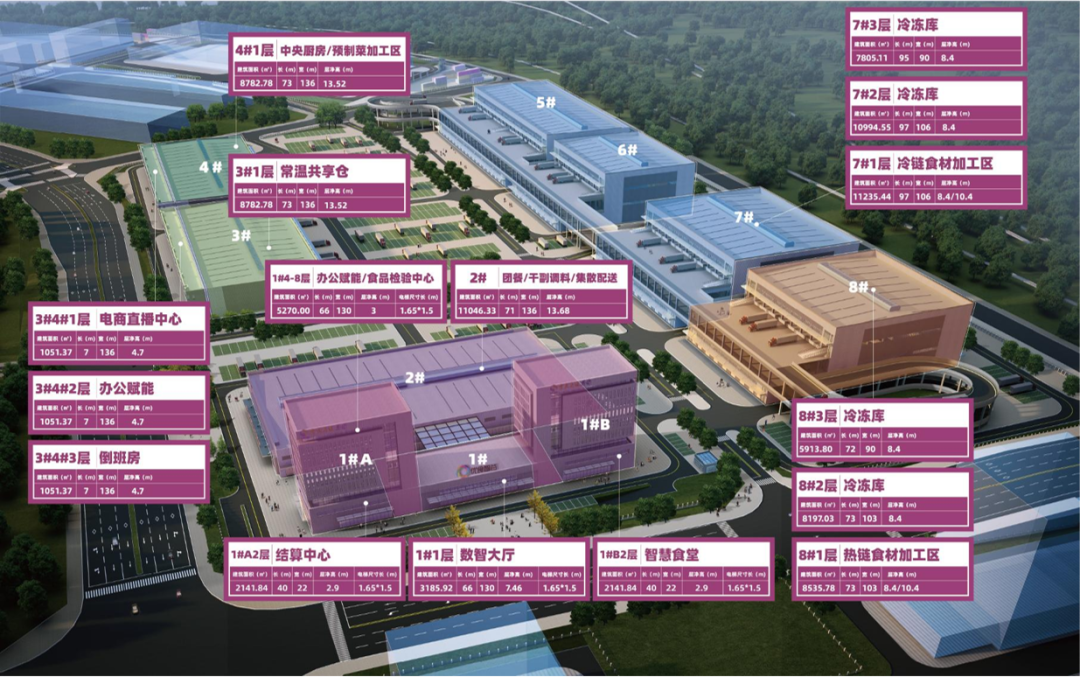 园区规划有仓储区(恒温仓、冻库)、生产加工区(预制菜、冷链热链加工)、分拣配送中心、展示销售区(电商直播、交易展览)、综合服务区(政策一站式中心、检验检测专区、人才居住专区、金融服务专区)。