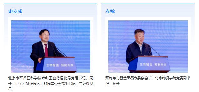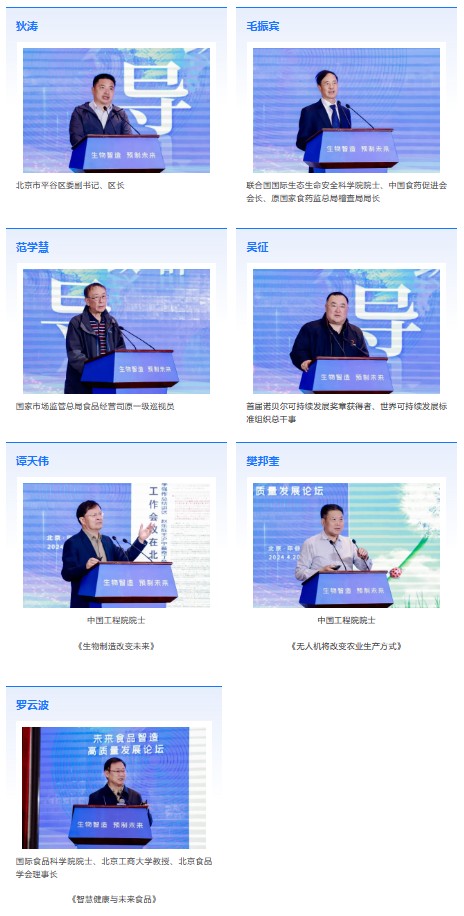 中国工程院院士谭天伟、樊邦奎,国际食品科学院院士、北京工商大学教授、北京食品学会理事长罗云波,联合国国际生态生命安全科学院院士、中国食药促进会会长毛振宾,北京市平谷区委副书记、区长狄涛,中国食药促进会会长、国家市场监管总局食品经营司原一级巡视员范学慧,首届诺贝尔可持续发展奖章获得者、世界可持续发展标准组织总干事吴征,中关村科技园区平谷园管理委员会党组成员、主任张子布,平谷区科学技术和工业信息化局党组成员、副局长李远,工信部赛迪研究院赛迪顾问县域经济研究中心主任余德彪,北京工商大学食品与健康学院副院长、预制菜与智慧团餐专委会秘书长李健,北京协同创新研究院食品科学与工程协同创新中心主任刘佳等院士、领导和专家出席了论坛并发表致辞和报告。