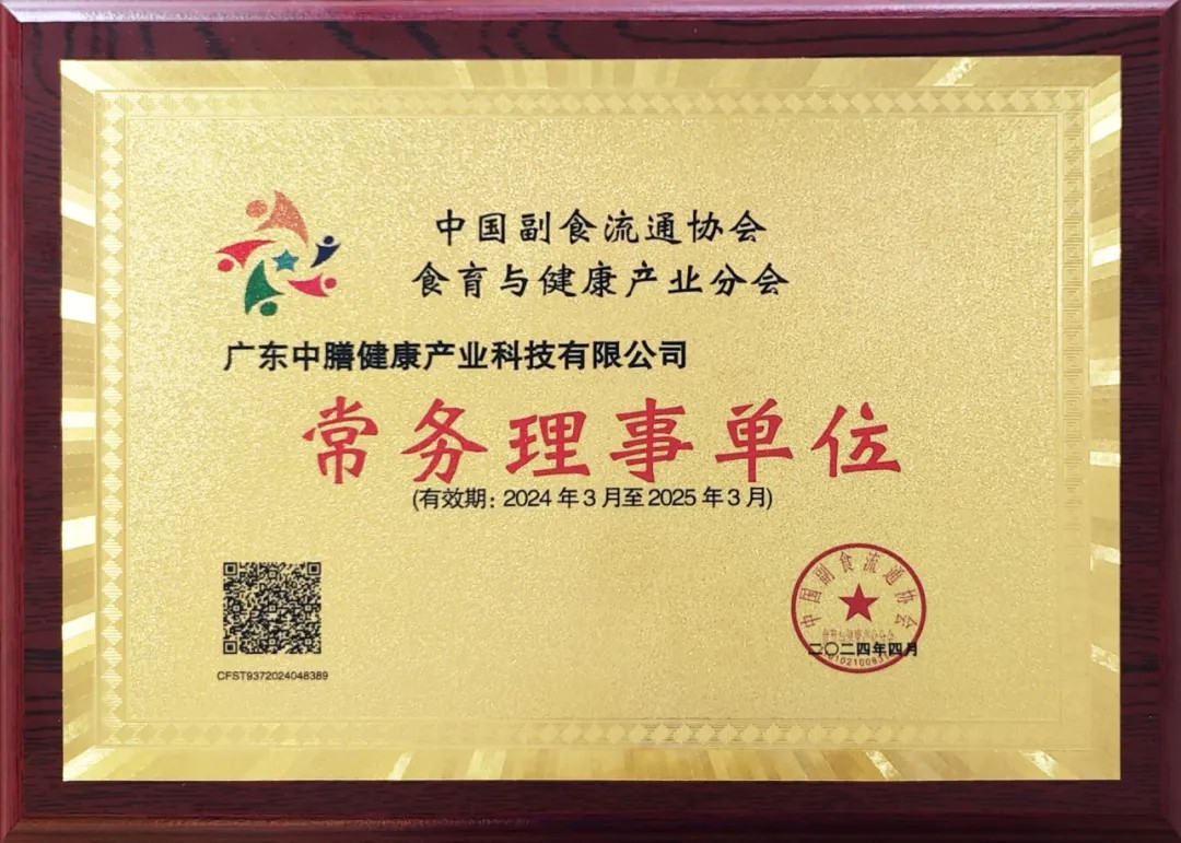 获授“中国副食流通协会食育与健康产业分会常务理事单位”
