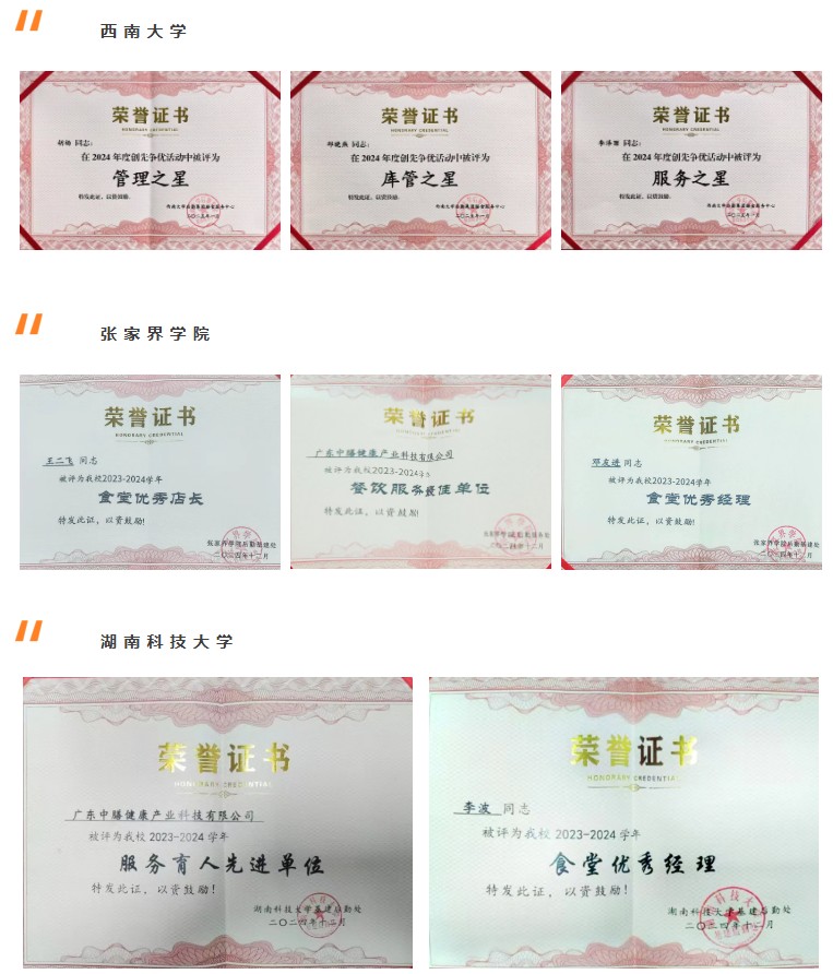 1月10日,西南大学、张家界学院、湖南科技大学的多多28餐厅分别获得学校后勤处2024年度表彰,餐厅多名员工荣获个人荣誉。此次表彰,是对多多28餐厅长期以来为师生提供优质餐饮服务的充分肯定,也是对多多28集团“用心服务,追求卓越”服务理念的最佳诠释。