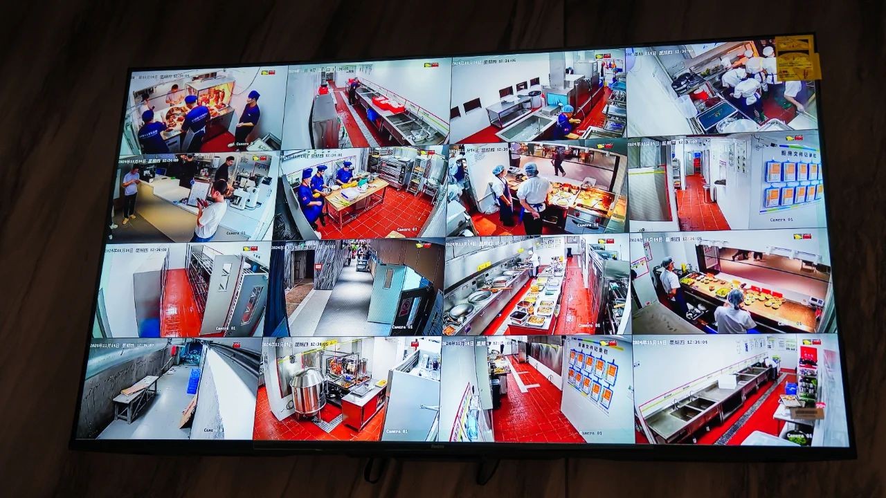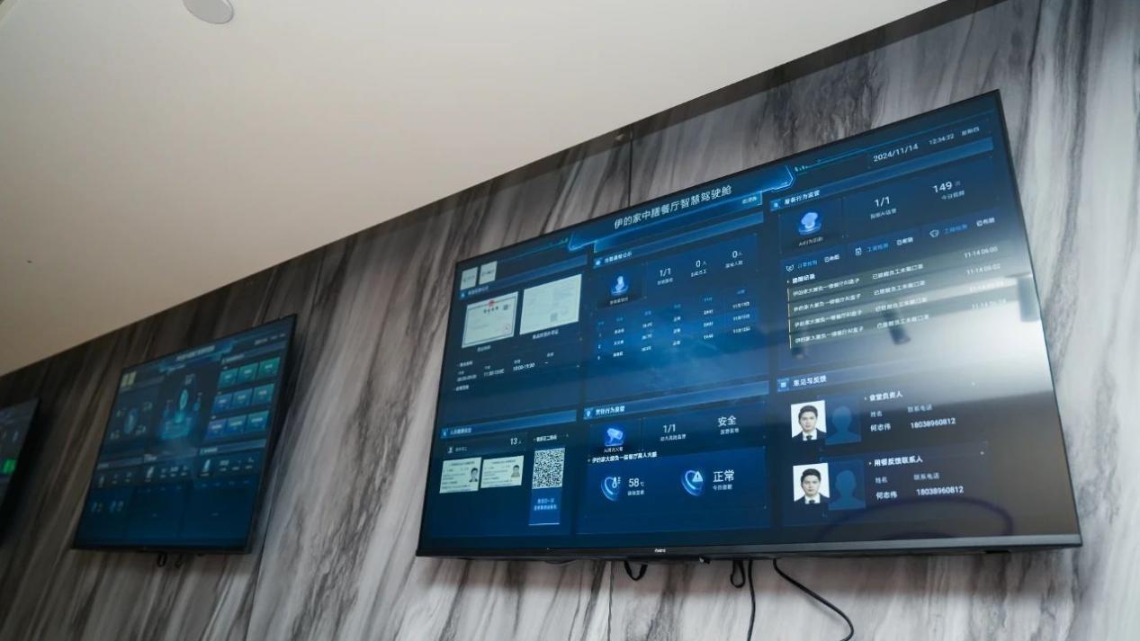 餐厅依托人工智能数字化技术、智能物流硬件、数据治理技术手段,打造智能人脸晨检门禁、智能 AI 留样秤、智能留样柜、离人监管预警、主食仓库物联中控屏等一系列后厨智能设备。屏幕接入本地明厨亮灶画面,后厨动态一目了然,全流程记录规范后厨运作,让食品生产加工过程可视、可感、可知。